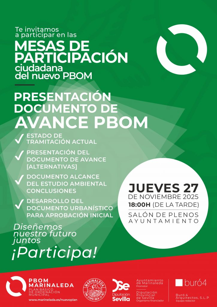 El Ayuntamiento de Marinaleda te invita a participar en la presentación del Documento de Avance del Plan Básico de Ordenación Municipal (PBOM), un paso clave dentro del proceso de planificación urbanística del municipio.
